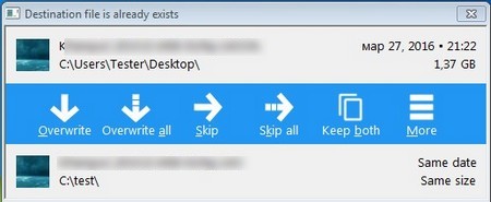 При копировании уже существующих файлов появляется меню с предложением выбора действий: